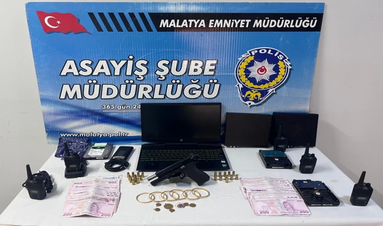 Yapılan aramalarda; 35 bin 950 TL nakit para, 1 tabanca ve 23 fişek, 1 dizüstü bilgisayar, 2 kamera kayıt cihazı ile 3 hard disk, 5 telsiz ve 2 iş yeri telefonu ile toplam piyasa değeri 739 bin TL olan ziynet eşyası ele geçirildi.