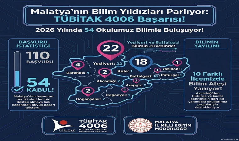 TÜBİTAK tarafından öğrencileri düşünmeye, araştırmaya, gözlem yapmaya ve bilimsel üretime teşvik etmek amacıyla yürütülen 4006 Bilim Fuarları Programı kapsamında açıklanan sonuçlarda Malatya’nın yüksek kabul oranıyla dikkat çektiği belirtildi.