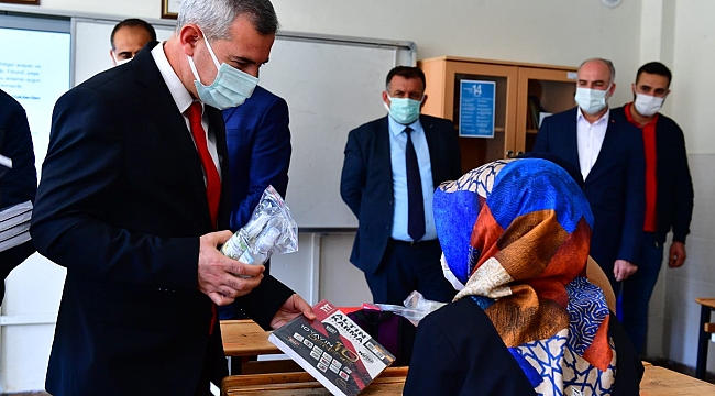 Yeşilyurt Belediyesi Kültür ve Sosyal İşler Müdürlüğü tarafından Polis Amca Ortaokulunda düzenlenen etkinlikte öğretmenler ve öğrencilerle buluşan Yeşilyurt Kaymakamı Turgay Gülenç ile Yeşilyurt Belediye Başkanı Mehmet Çınar, başarı dileklerinde bulundukları öğrencilere hazırlanan deneme setlerinin yanı sıra soru bankaları, maske ve el dezenfektanı dağıttılar.